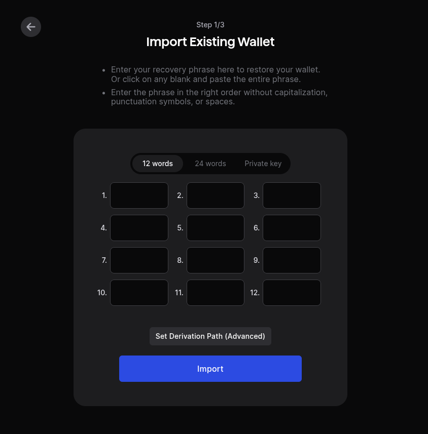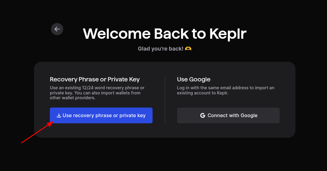 - If you select recovery phrase, you have to provide the mnemonic seed that was generated by Keplr or your previous wallet.