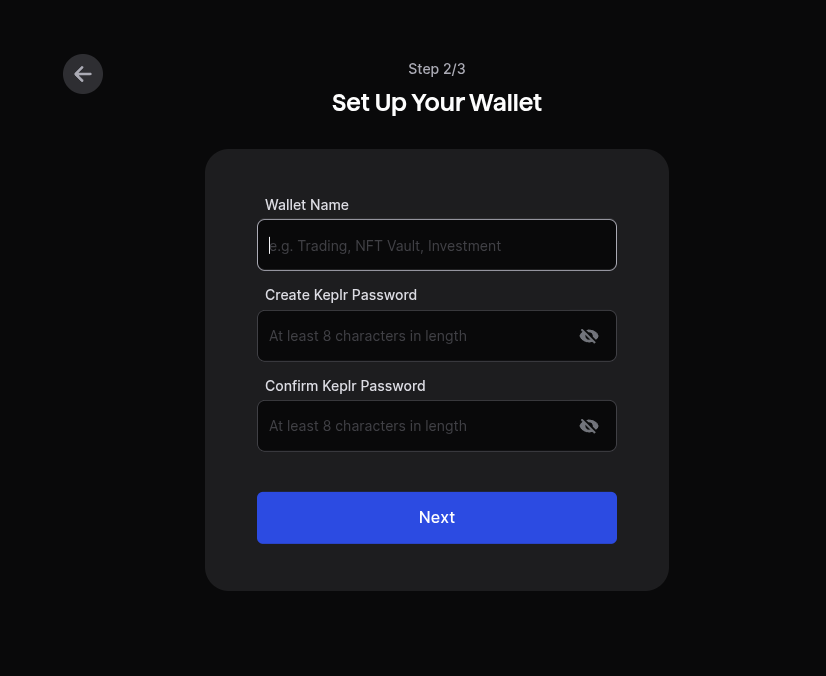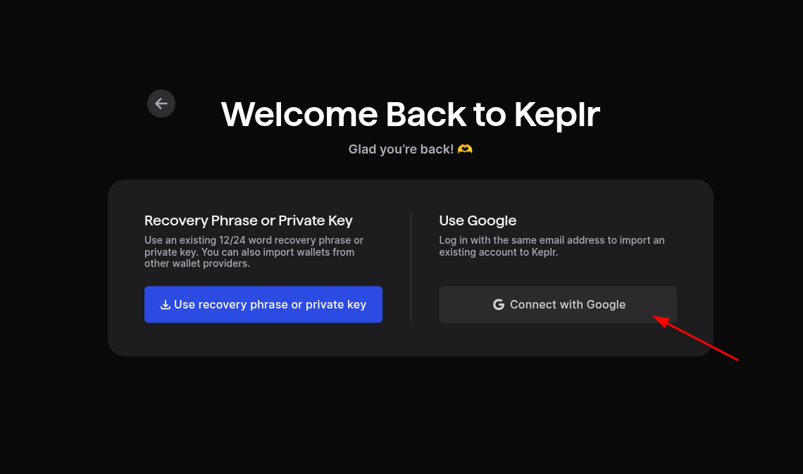 - If you select private key, you have to provide the private key that was generated by Keplr or your previous wallet.