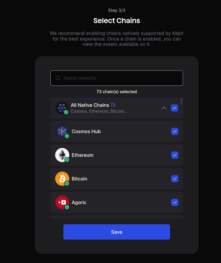 - (Optional) Select the chains you want to use (This can be changed later), then click "Save".