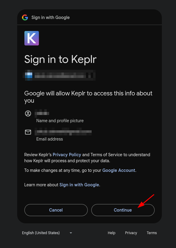 - Click "Continue" to allow Keplr to access your Google account.